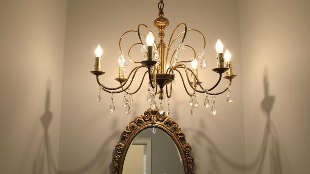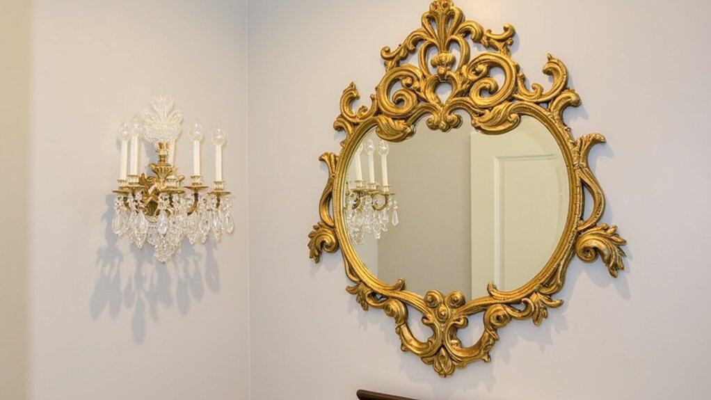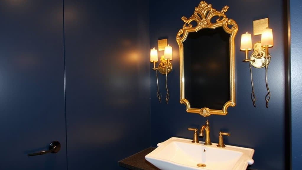 Countless ways exist to elevate your powder room, but upgrading to a glamorous mirror can steal the show. You’ll transform the space with a statement piece that’s both stylish and budget-friendly. Start by choosing a mirror with a bold frame, like gold or brushed nickel, sized around 24-30 inches wide.