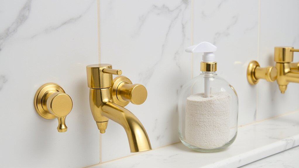 Shiny fixtures can instantly elevate your powder room, and opulent gold hardware is the perfect touch for sophistication. You can transform a plain space into a luxe haven with just a few swaps. Think about installing gold faucet handles (around 4 inches long) and matching cabinet pulls within a weekend.