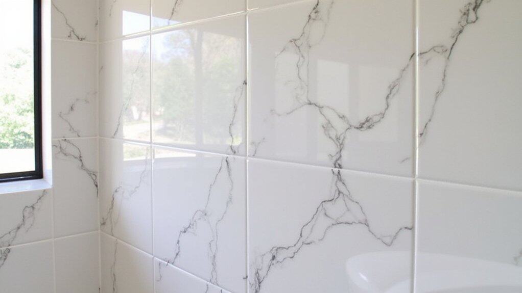 Moving from the elegance of a vintage chandelier, let’s focus on upgrading your powder room’s surfaces with luxurious faux marble tiles. You can transform a small space—think 5×5 feet—into a high-end haven in just one weekend. These tiles, often 12×24 inches, mimic real marble’s veining at a fraction of the cost.
