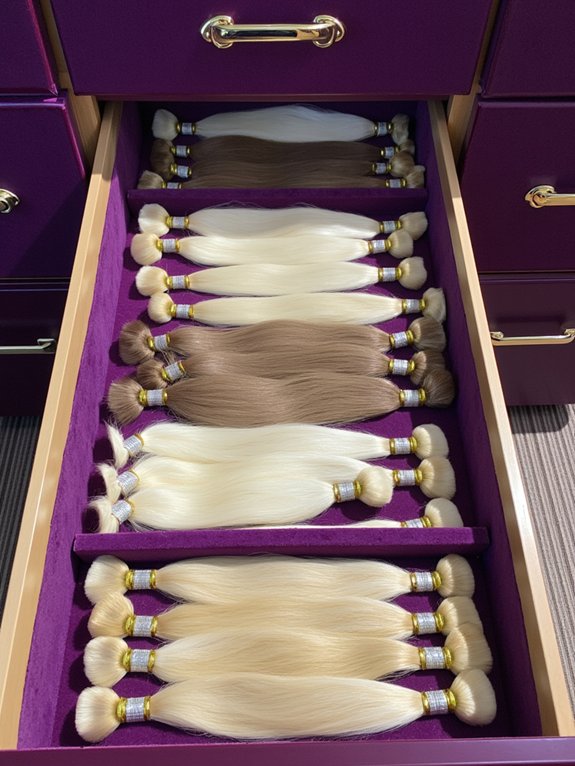 The drawer system allows for easy organization and access to multiple extension sets, making it simple to maintain and preserve your investment. The luxurious presentation enhances any vanity area while encouraging proper care and maintenance of the hair pieces through visible, convenient storage.