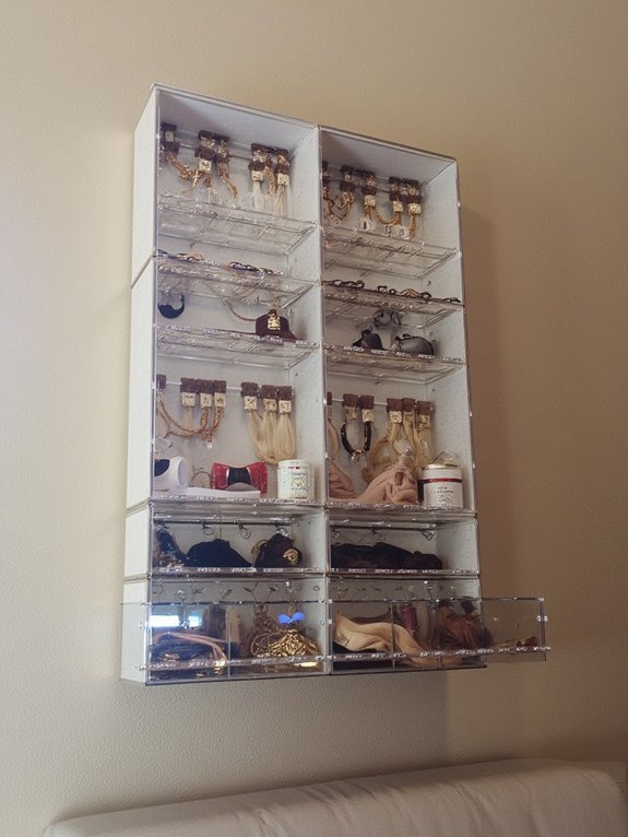A hanging jewelry box organizer serves as an innovative storage solution for hair extensions, despite not being specifically designed for this purpose. The clear, zip-close compartments protect extensions from dust and humidity while keeping them organized and visible through transparent pockets.