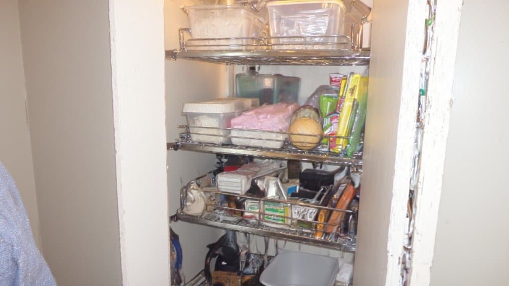 Installing pull-out racks in a storage closet can transform cluttered spaces into accessible, organized areas. Begin by measuring the dimensions of your closet to determine the size and number of racks needed, guaranteeing they fit within the available space. Choose sturdy, high-quality racks with smooth gliding mechanisms to handle the weight of stored items like canned goods, cleaning supplies, or tools.