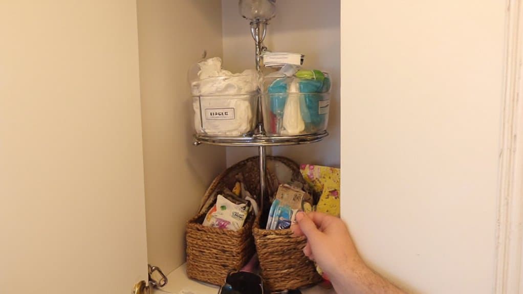 To organize with a rotating carousel, start by categorizing items like cleaning supplies, small tools, or seasonal accessories, and place them in labeled bins or containers on the carousel. Group frequently used items on the top or most accessible tier for quick retrieval, while storing less-used items on lower tiers or toward the back. Regularly rotate and reassess the contents to keep the carousel clutter-free and functional, guaranteeing that every item has a designated spot.