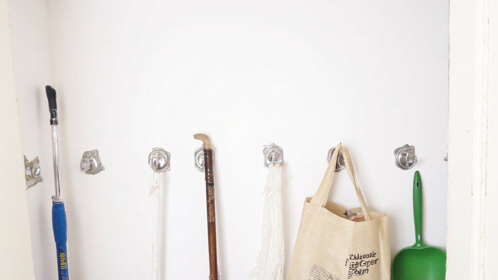 To install, choose sturdy hooks that can support the weight of your items and use appropriate hardware, like anchors or screws, for secure mounting on drywall or studs. Organize items by type or frequency of use, hanging similar tools together or prioritizing everyday essentials in the most reachable spots. This method not only declutters the floor space but also keeps frequently used items within arm’s reach for quick retrieval.