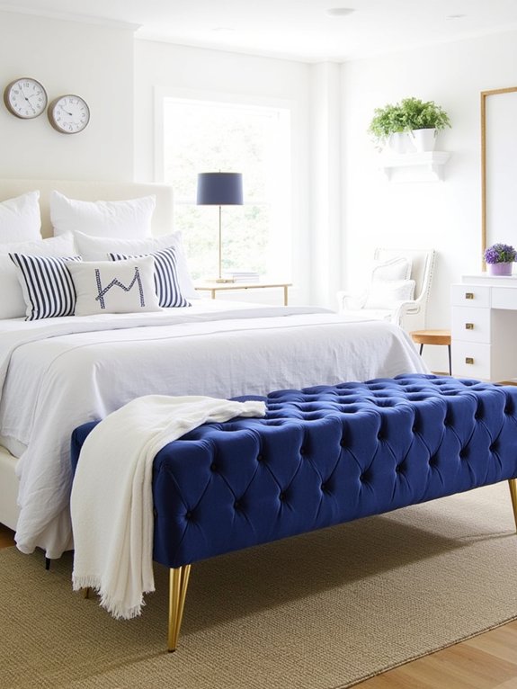 When selecting a bench, the width should complement the bed size, with 48-54 inches suitable for queen beds and 60-72 inches for king beds. Positioning the piece 12-18 inches from the bed’s edge ensures proper spacing, while color choices like navy, emerald, or blush pink can be coordinated with existing decor to enhance the room’s overall aesthetic.