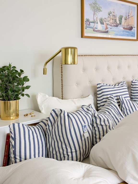 Classic silk wall sconces feature refined fabric shades and polished metal hardware that bring timeless elegance to preppy bedroom designs. The silk texture diffuses light beautifully, creating soft, sophisticated illumination that enhances the room’s overall aesthetic.