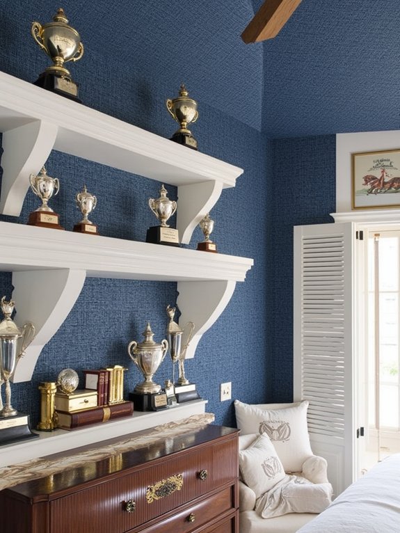 A collection of vintage polo trophies displayed thoughtfully creates an elegant and sophisticated focal point in any bedroom. The gleaming metal and classic designs showcase the rich heritage of this timeless sport while adding refined character to the space.
