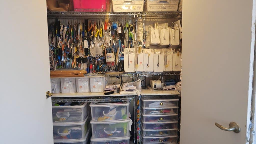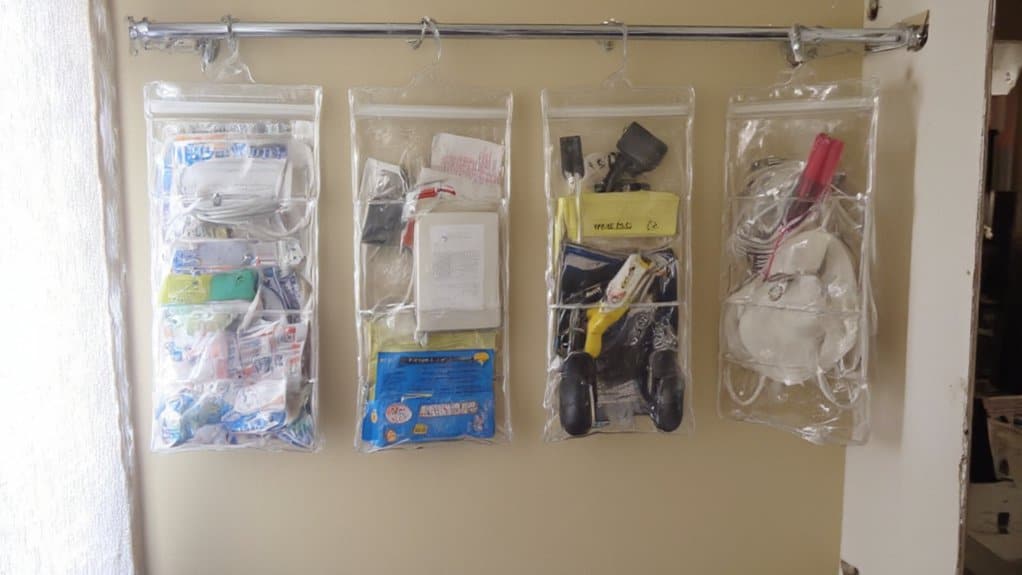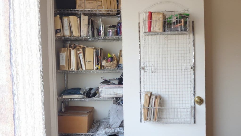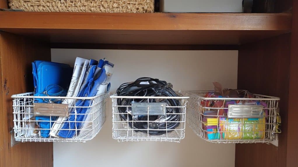 Hanging organizers are a fantastic solution for maximizing vertical space in an office closet, especially when shelf or floor space is limited. These organizers typically feature multiple compartments or pockets and can be hung from a closet rod or hooks, making them ideal for storing smaller items like stationery, cables, or even files. Choose a sturdy organizer with a design that suits your needs, guaranteeing it can hold the weight of the items you plan to store without sagging.