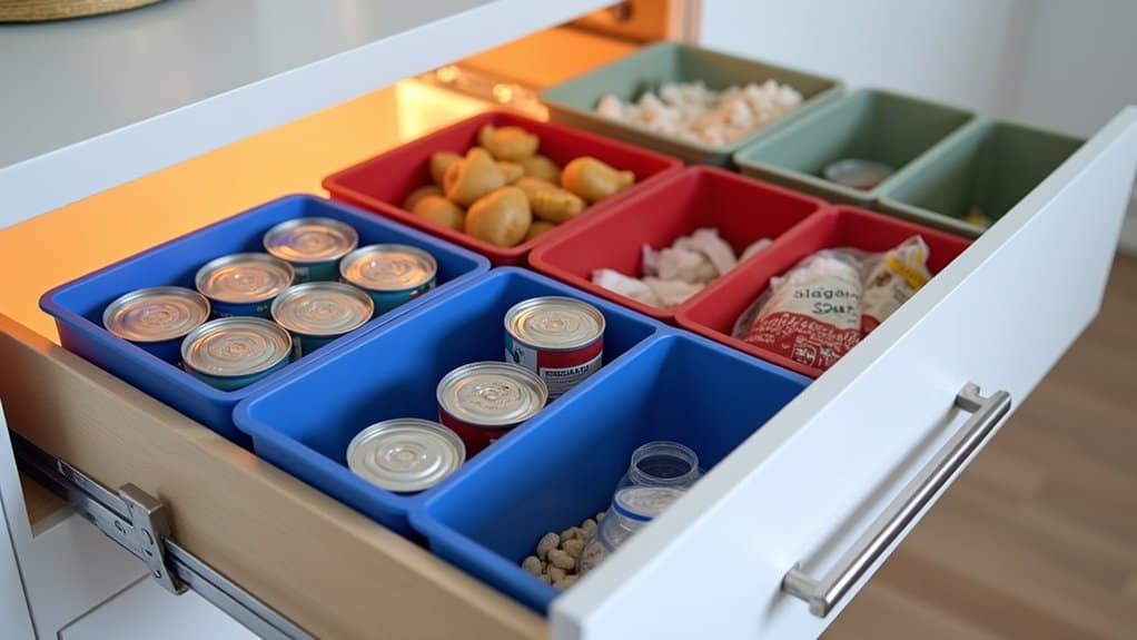 To implement this system, start by sorting pantry items into groups and purchasing or repurposing colored containers or stickers that align with your chosen scheme. Apply the color-coded labels or liners to each drawer section, ensuring consistency across all drawers for a cohesive look. Regularly review and adjust the system as needed to accommodate new items or changing storage needs, maintaining clarity and efficiency in your pantry organization.