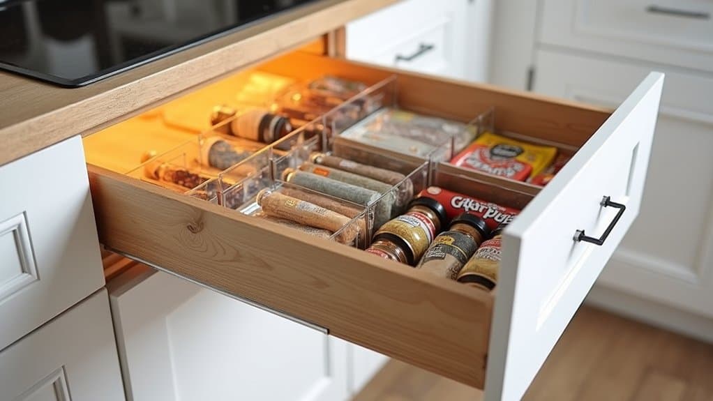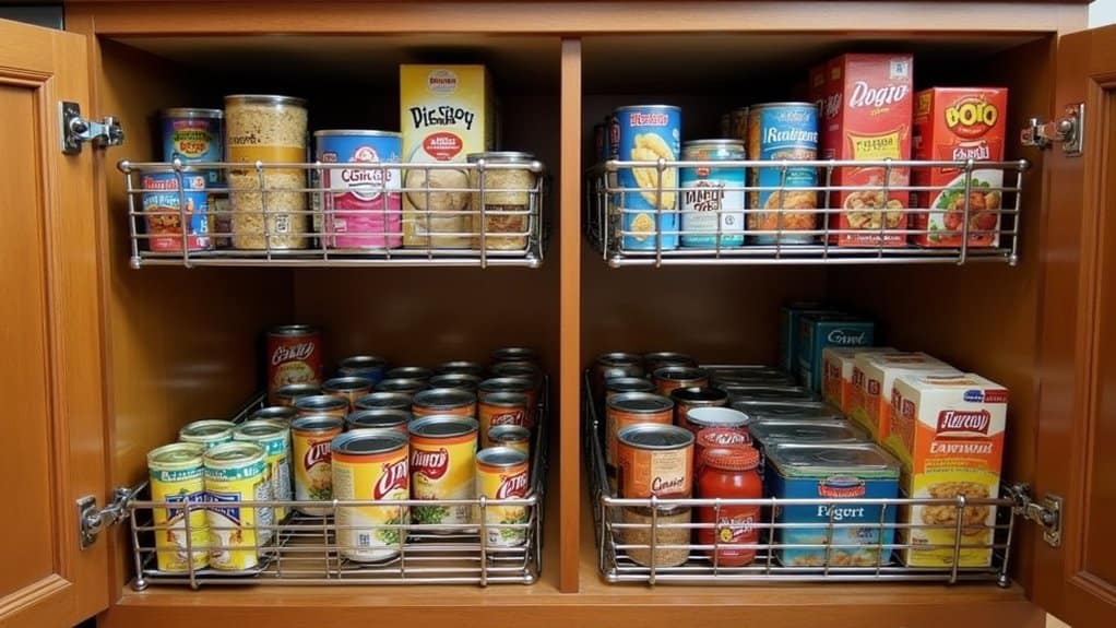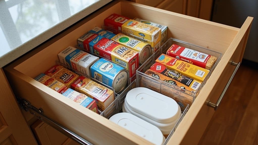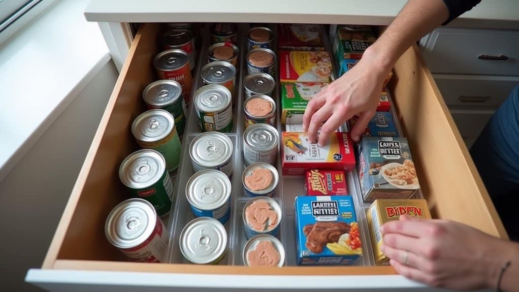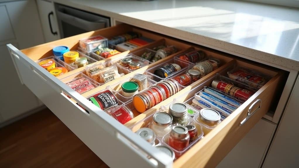 Hey, let’s chat about organizing your pantry with pull-out drawers for super easy access! I’ve totally transformed my kitchen chaos with these, and I’m pumped to share how. Start by measuring your shelves—mine are 24 inches deep, so I grabbed drawers to match. Install them with smooth glides for a hassle-free pull. Curious about grouping stuff for max efficiency? Stick with me for the next handy tip!