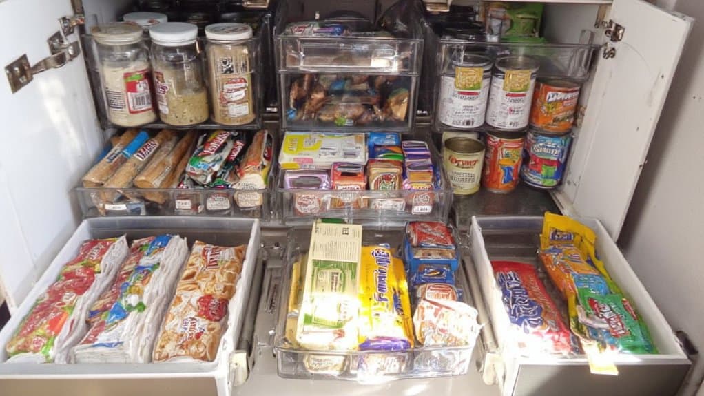 Rotating stock regularly in your pull-out drawer pantry is a key strategy to guarantee that food items are used before they expire. Start by checking expiration dates on canned goods, packaged foods, and spices each time you restock or monthly during a quick pantry audit. Move older items to the front of the drawer and place newer purchases at the back to encourage using the oldest products first.