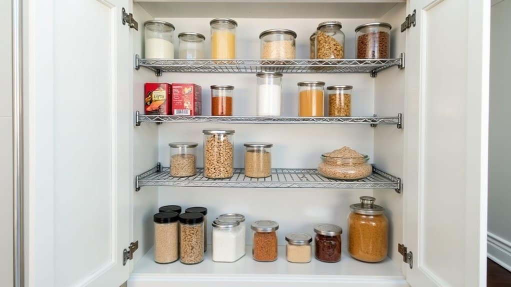 Customizing shelf heights in a pull-out pantry is a practical way to maximize space and guarantee easy access to various items. Start by evaluating the types of products you store, such as tall cereal boxes, short spice jars, or bulky canned goods, and group them by size. Adjust the shelves to accommodate the tallest item in each category, leaving a little extra room above for ease of removal. This tailored approach prevents wasted vertical space and keeps everything visible and reachable.
