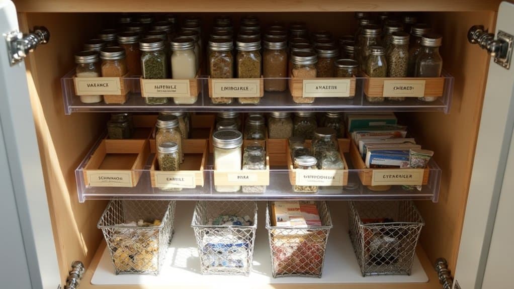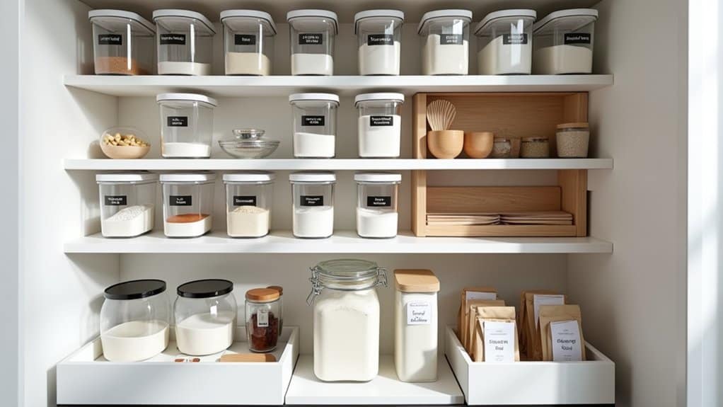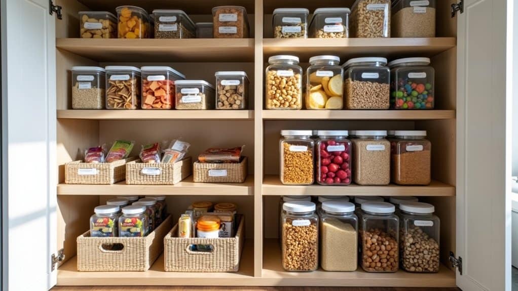 Managing snacks and dry goods in a pull-out shelf pantry can transform a cluttered space into an efficient storage hub. Start by categorizing items into groups, such as chips, crackers, nuts, and dried fruits, to create a clear system for quick access. Use clear, labeled containers or bins to store these categorized items, guaranteeing visibility and preventing overbuying due to hidden stock. Place frequently used snacks at eye level on the pull-out shelves for easy reach, while reserving higher or lower shelves for bulk or less-used items. Finally, consider portioning out snacks into smaller containers to control servings and maintain freshness.