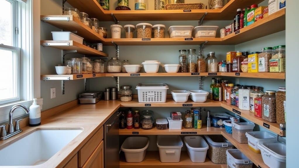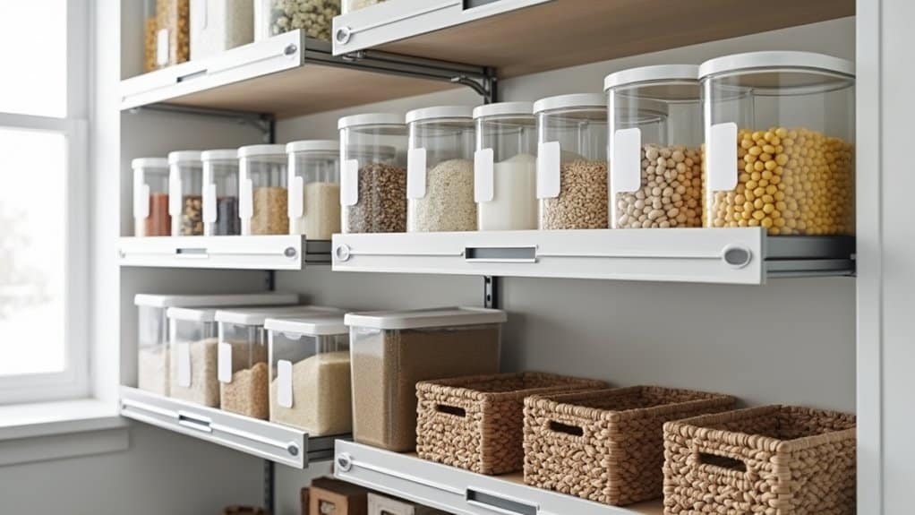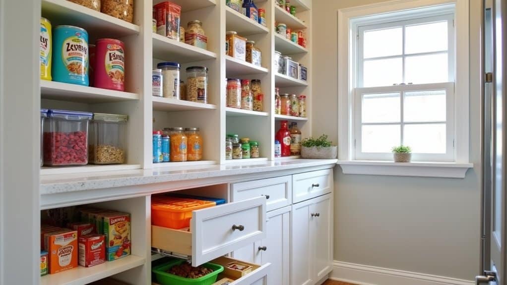 Creating a kid-friendly pantry layout with pull-out shelves involves balancing accessibility, safety, and organization to guarantee young children can reach their snacks and essentials while minimizing messes and risks. Start by designating the lower pull-out shelves for kid-friendly items like granola bars, crackers, and reusable water bottles, placing them at a height that children can easily reach without climbing. Use clear, labeled bins or containers on these shelves to help kids identify contents quickly and encourage them to put items back in their proper place. Additionally, make certain that heavy or breakable items, such as glass jars or large cans, are stored on higher shelves out of reach to prevent accidents.
