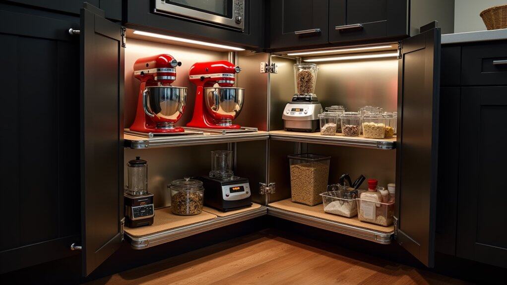 Pull-out shelves are an excellent solution for storing heavy appliances in a pantry, as they provide easy access and reduce the strain of lifting cumbersome items. Begin by evaluating the weight and size of your appliances, such as stand mixers, blenders, or food processors, to determine the appropriate shelf strength and dimensions. Opt for heavy-duty pull-out shelves with a high weight capacity, often made of sturdy materials like steel or reinforced wood, to guarantee they can handle the load without sagging. Install these shelves at a lower height in the pantry to minimize the risk of injury when sliding out heavy items, and make sure the sliding mechanism is smooth and secure to prevent tipping.