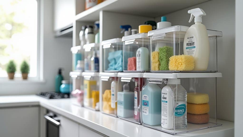 To maintain tidiness, label each bin or section with the type of cleaning supply it holds, making sure everything has a designated spot. Regularly check the inventory to discard empty bottles or expired products, which helps avoid clutter buildup. Store frequently used items on the most accessible shelves, while placing less-used supplies on higher or lower levels to maximize efficiency. Finally, make certain that any hazardous chemicals are stored securely, out of reach of children or pets, even in a pull-out system, to maintain safety.