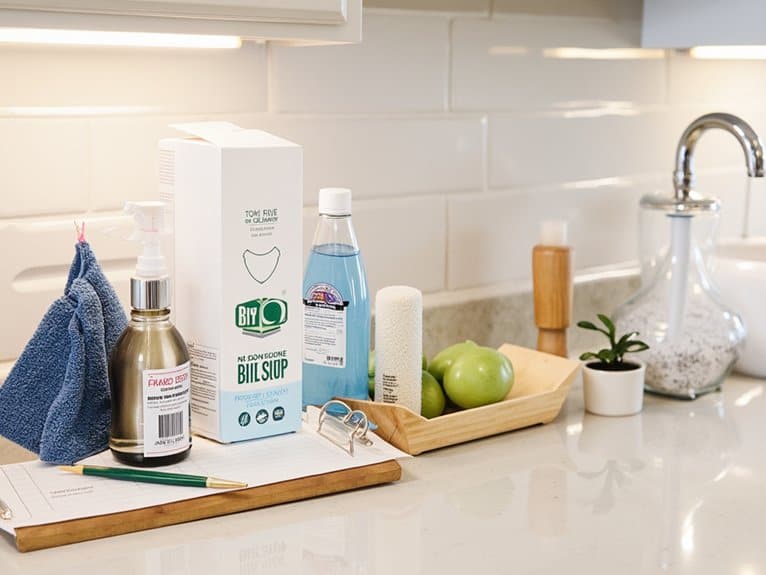 Before starting a thorough kitchen cleaning routine, gathering the right supplies guarantees an efficient and effective process. Essential cleaning tools include: