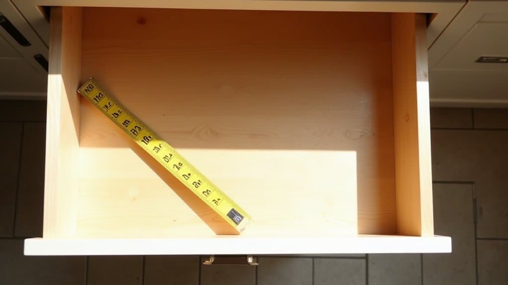 Next, examine the condition of the drawer itself to verify it’s functional for storage. Check for any damage, such as cracks or sticky spots, and clean the interior thoroughly to create a fresh base for organizing. If the drawer lacks built-in compartments, consider whether you’ll need to add adjustable dividers or bins to maximize space. Finally, think about the weight capacity of the drawer to avoid overloading it with heavy items, which could lead to wear and tear over time.
