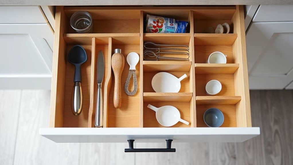 Installing adjustable dividers in your pantry drawer is a practical way to customize storage and keep items neatly separated. Begin by measuring the dimensions of your drawer to guarantee the dividers you choose will fit properly. Adjustable dividers are typically spring-loaded or telescopic, allowing them to expand or contract to match the drawer’s width or length. Place the dividers in the drawer, spacing them according to the size of the items you store, such as snacks, utensils, or spice packets.
