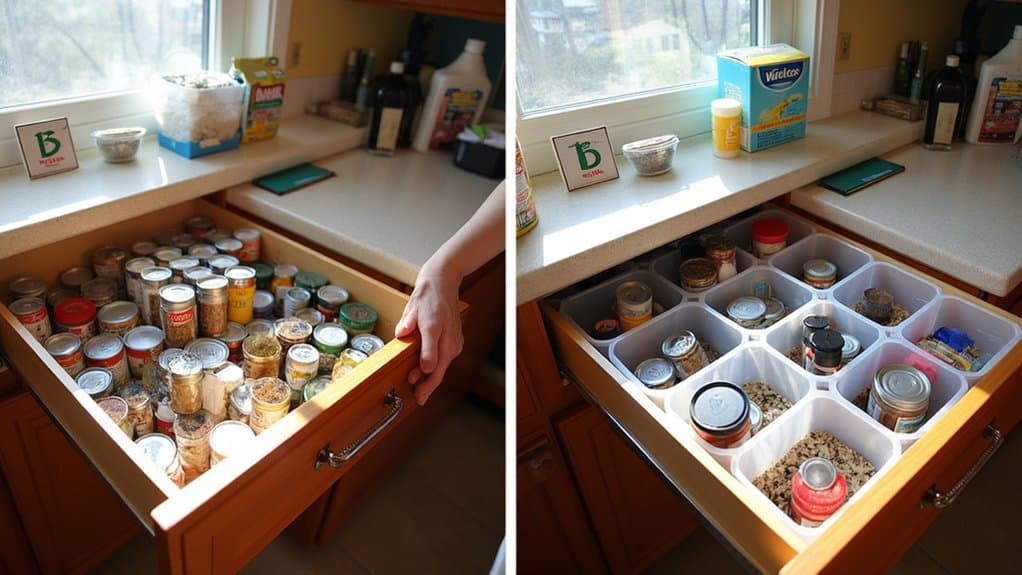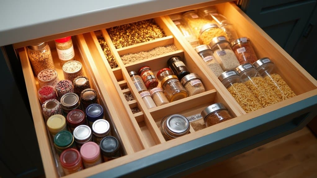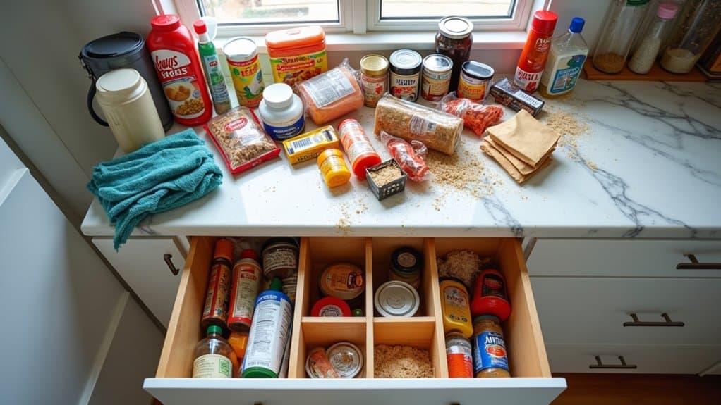 Ever feel like your pantry drawer is a treasure chest, but instead of gold, it’s hiding expired canned goods and mystery packets? Hey, I’ve been there—digging through chaos just to find a snack! Let’s tackle this mess together. Start by pulling everything out and evaluating your drawer space, roughly 12 by 18 inches for most setups. Trust me, there’s more to uncover that’ll transform your kitchen game!