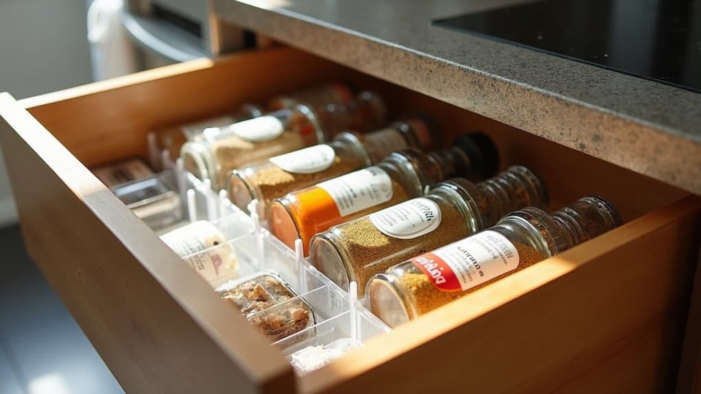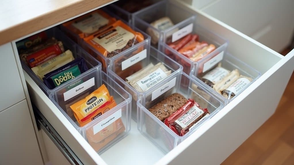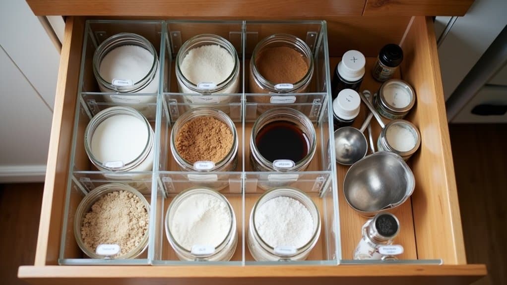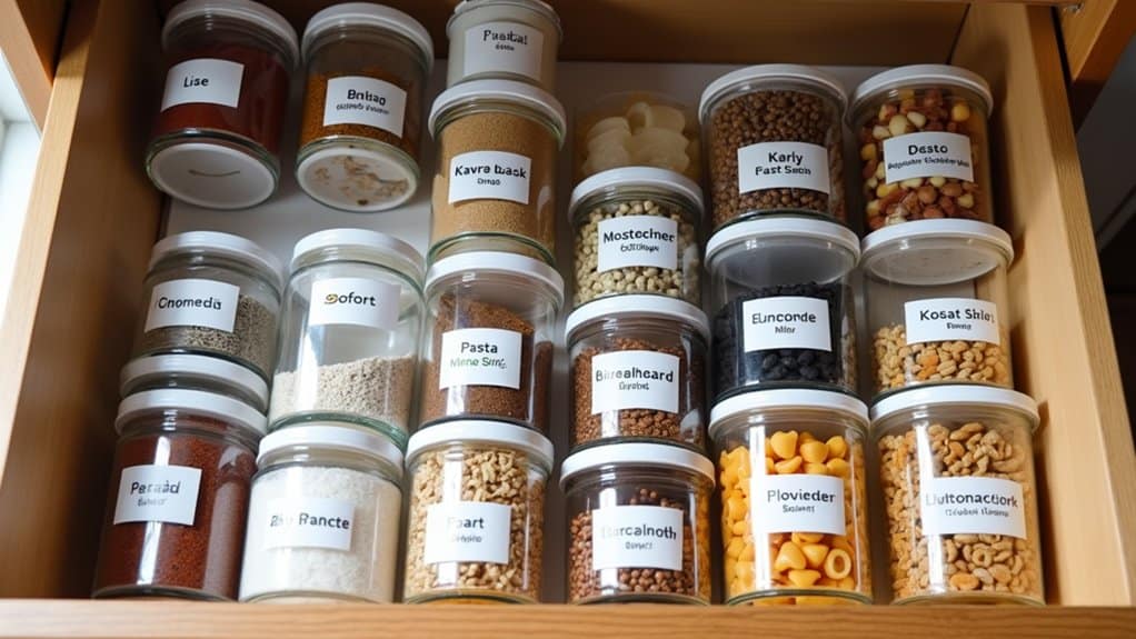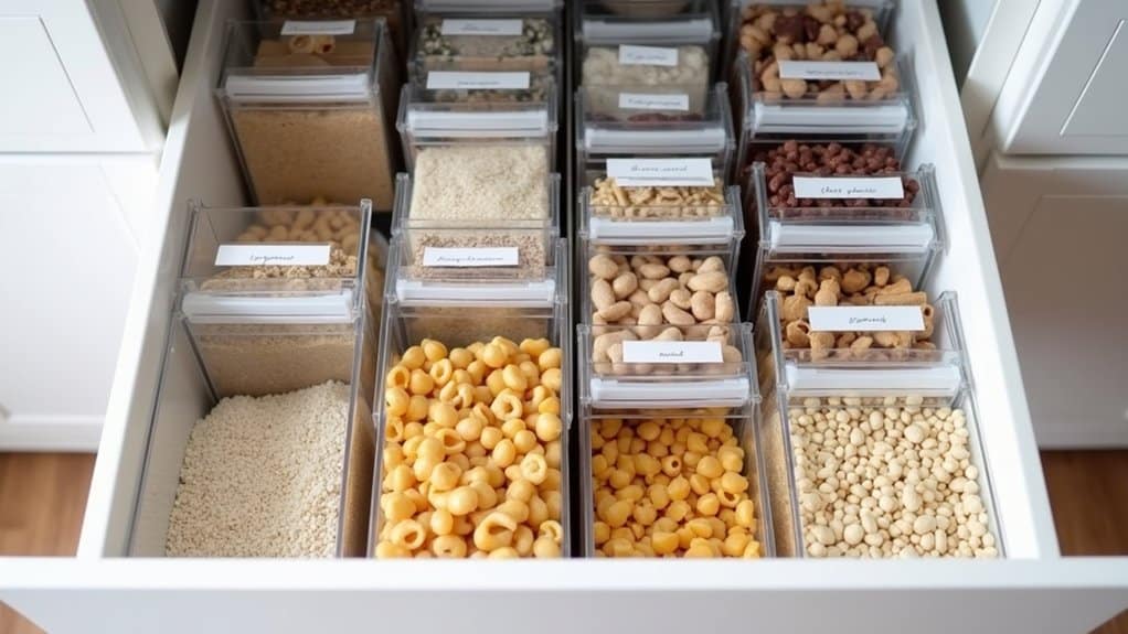 Clear containers are a game-changer when it comes to organizing your pantry drawer for maximum visibility. Start by selecting a variety of clear plastic or glass containers in different sizes to accommodate items like snacks, spices, or baking supplies. Transferring items from their original packaging into these containers not only creates a uniform look but also allows you to instantly see what’s inside without rummaging through opaque boxes or bags. LABEL each container with its contents using a label maker or simple adhesive tags to guarantee quick identification, especially for similar-looking items like flour and sugar.