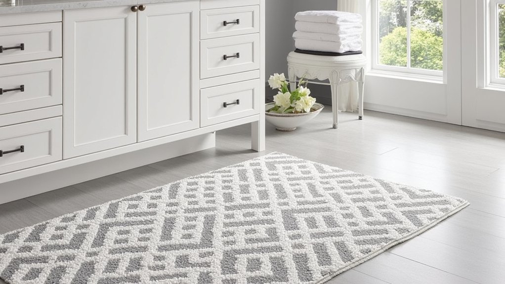 Let’s turn your attention to the floor with a chic bathroom rug that’ll transform your space. A well-chosen rug adds warmth and style underfoot in just 10 minutes of setup.