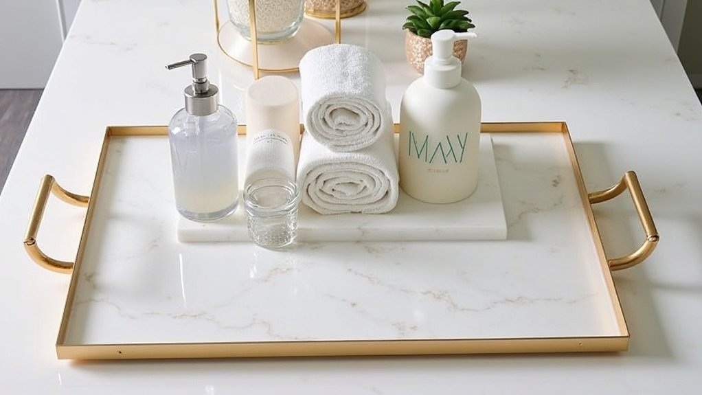 Moving from the floor up to the counter, it’s time to organize with an elegant vanity tray that elevates your guest bathroom. This small addition, ideally 12×8 inches, can transform clutter into style within 10 minutes. Place it on the counter for instant impact.