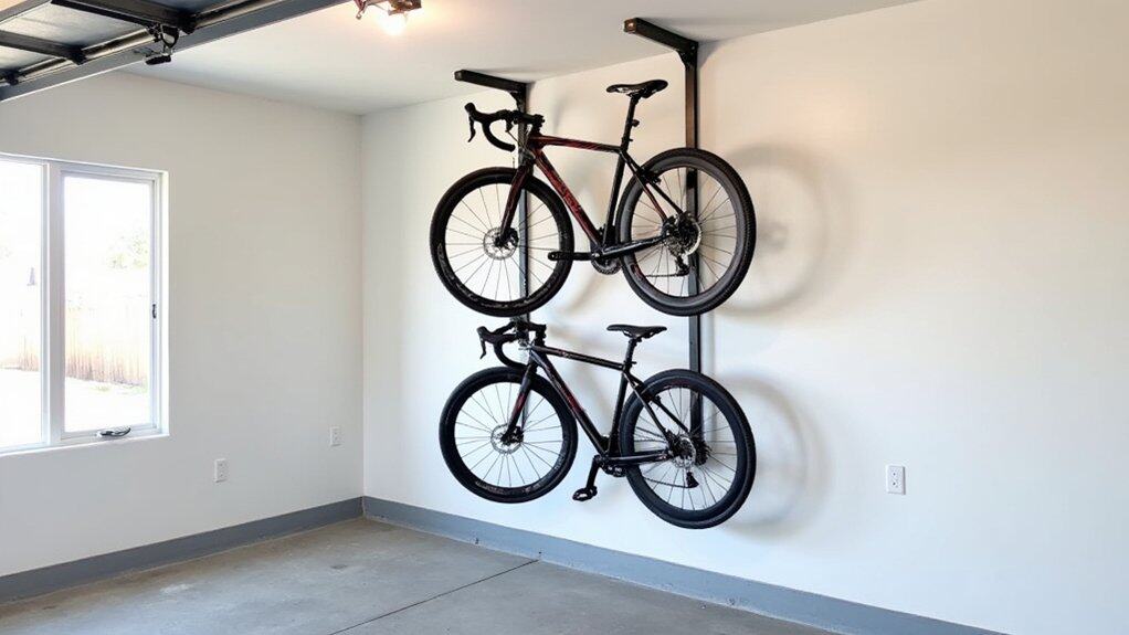 To organize multiple bikes, stagger the hooks at different heights to prevent handlebars from clashing and to save space. Confirm the hooks are padded or coated to avoid scratching the bike frames, and hang the bikes by their front wheels for easy access. This setup not only declutters your garage but also makes it simple to grab a bike for a quick ride.