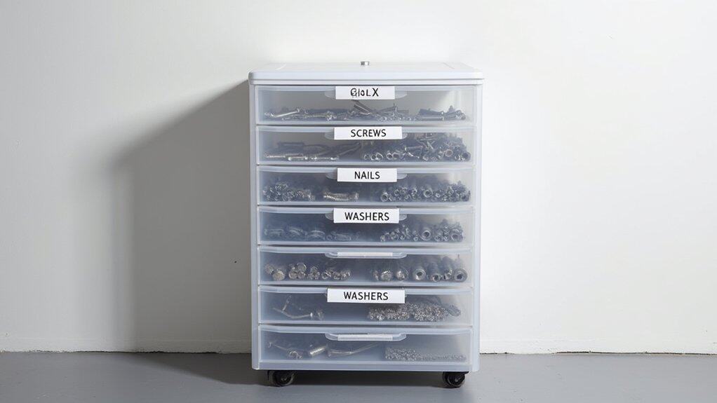 To maintain organization, designate a specific drawer for each category and avoid mixing unrelated items. Regularly check the drawers to guarantee items are returned to their proper places after use. This system not only saves time but also prevents the frustration of searching for misplaced tools or hardware in a cluttered garage.