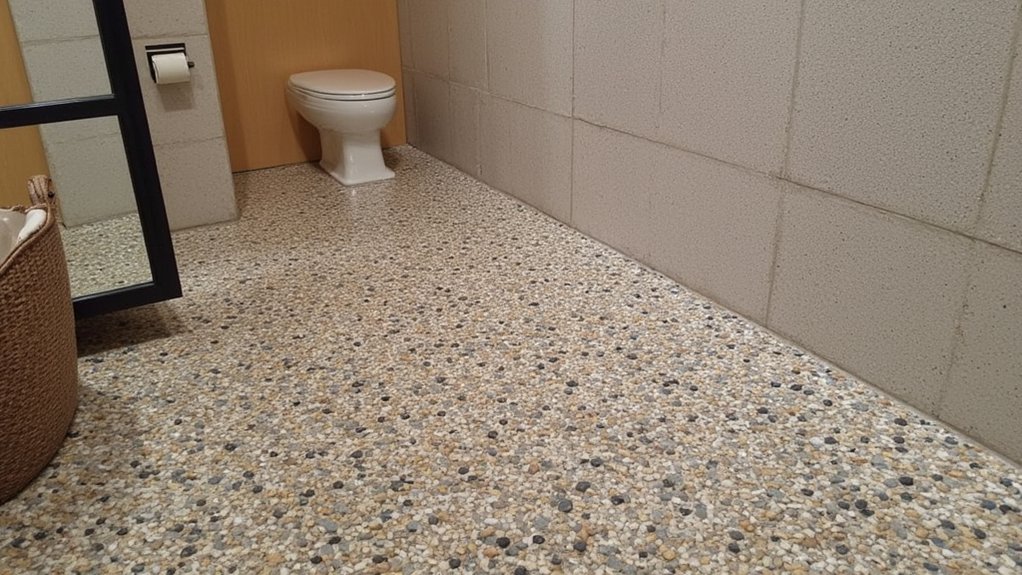 Elevate your bathroom’s spa vibe by swapping a standard floor for a relaxing stone pebble design after enjoying the warmth of heated tiles. You’ll love the natural texture underfoot, mimicking a serene riverbed. It’s easy to install with some prep.