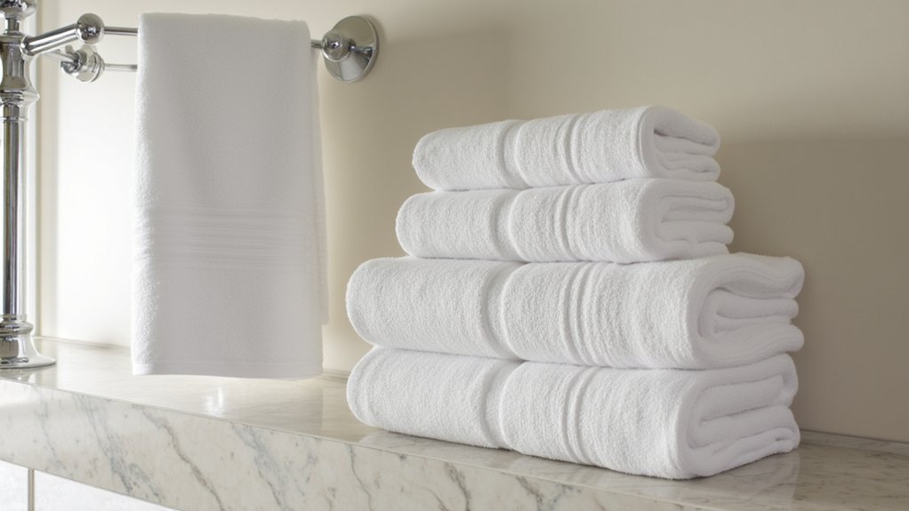 Moving from the calming glow of aromatherapy candles, let’s focus on another simple way to elevate your bathroom’s spa feel with luxurious plush towels. You can transform your space with soft, thick towels that wrap you in comfort. “Choose high-quality cotton with a GSM of 600-800 for ultimate fluffiness,” says textile expert Laura Hensley.