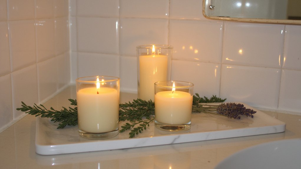 How can you turn your bathroom into a calming retreat with just a small addition? By adding soothing aromatherapy candles, you’ll instantly create a spa-like vibe. Place them strategically for safety and effect; they’re simple yet powerful.