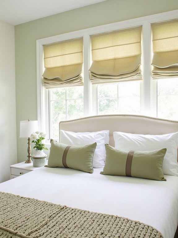 Sage green cotton valances offer elegant window treatments that filter natural light while adding subtle sophistication to bedroom spaces. Their relaxed yet tailored appearance works well with both contemporary and classic interior designs, especially when paired with cream-colored walls for a harmonious aesthetic.