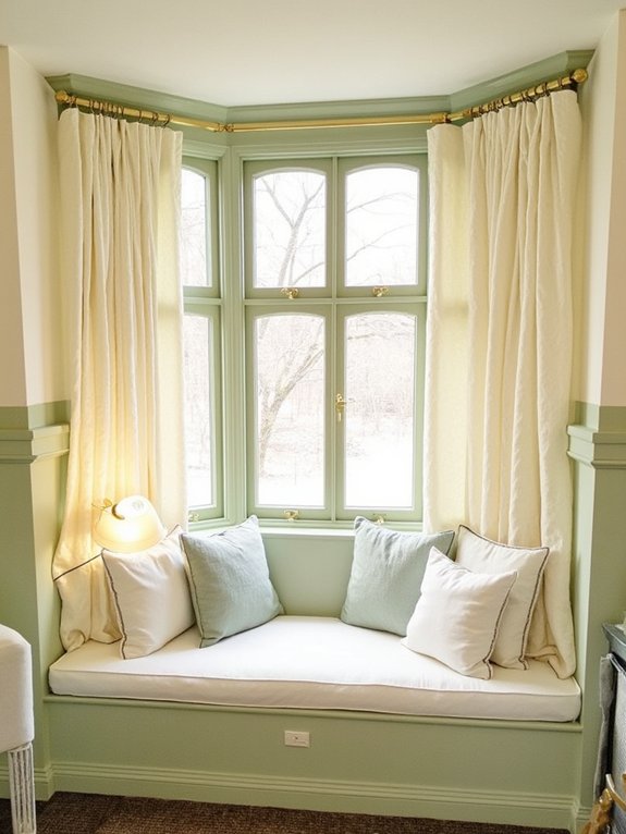 Window frames painted in sage green create an elegant focal point that enhances natural light while complementing sage-colored decor throughout the room. The earthy tone frames views to the outdoors, effectively bridging interior and exterior spaces with its organic appeal.