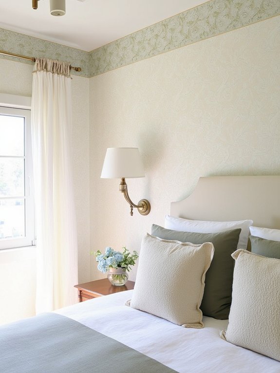 A sage leaf wallpaper border creates an elegant transition between cream walls and complementary decor elements. The natural leaf patterns coordinate with sage wall art and accent pillows while adding sophistication without dominating the space.