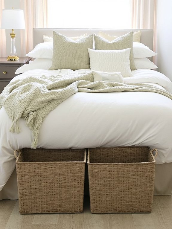 Sage-colored storage baskets combine practical organization with aesthetic appeal, featuring designs from handwoven seagrass to structured rattan. These versatile containers complement cream-toned decor while providing elegant storage solutions for bedside essentials, seasonal clothing, extra linens, and decorative pillows.