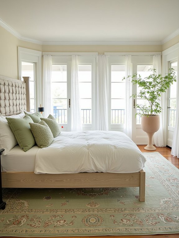 For proper placement and scale, choose an 8×10 or larger rug that extends 24-36 inches beyond each side of the bed. Look for designs featuring distressed sage patterns with cream accents to create a cohesive look that anchors the space while adding authentic character and depth.