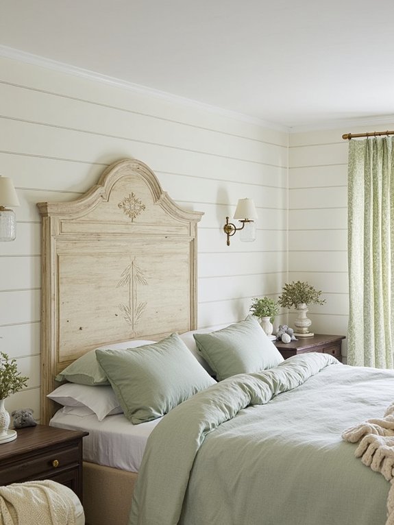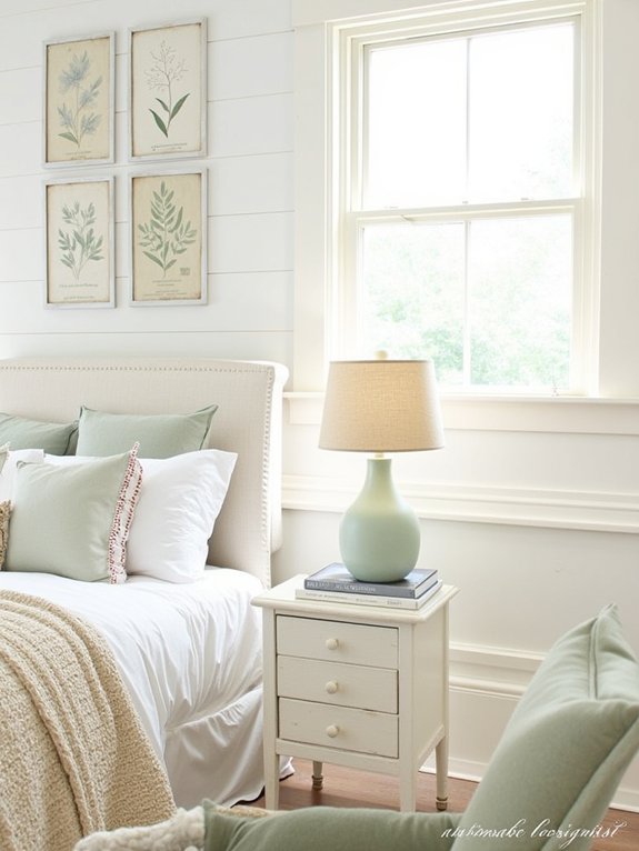 Sage eucalyptus wall art combines natural botanical elements with farmhouse aesthetics to create a peaceful bedroom atmosphere. The soft green hues and delicate leaf patterns bring an organic touch to spaces featuring shiplap walls and vintage furnishings.