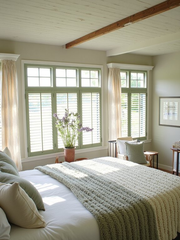 Rustic window shutters in sage green tones bring authentic farmhouse character to bedroom spaces while offering practical light control. The distressed paint finish and wrought iron hardware create a vintage aesthetic that enhances both interior and exterior appeal.