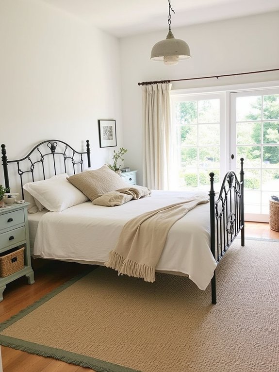 A sage green jute rug merges natural fiber construction with subtle color for a refined farmhouse aesthetic. The woven jute material provides durability and organic texture while incorporating soft sage green patterns that add visual depth to any room, particularly bedrooms seeking an earthy foundation piece.