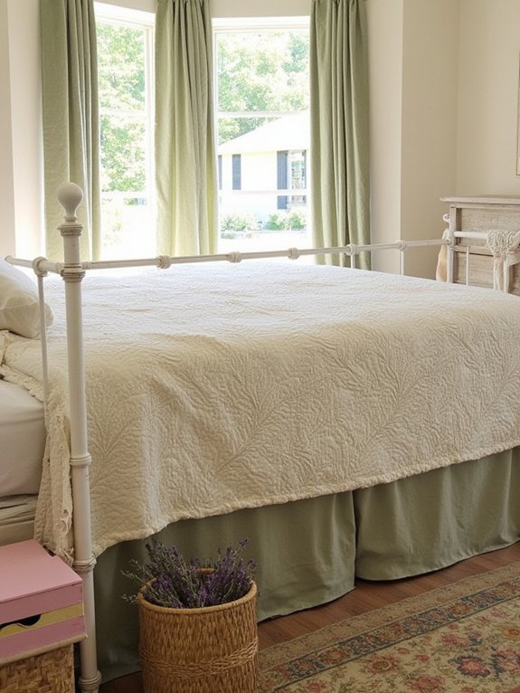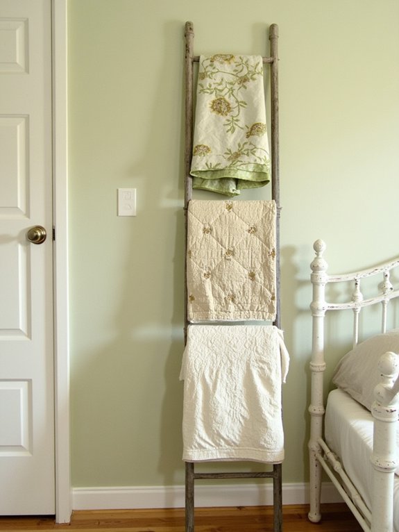A sage green ladder display offers a practical and stylish way to store quilts and blankets while creating an appealing decorative element. The vintage-style ladder, painted in soft sage, leans against the wall to showcase bedding while freeing up valuable closet space.