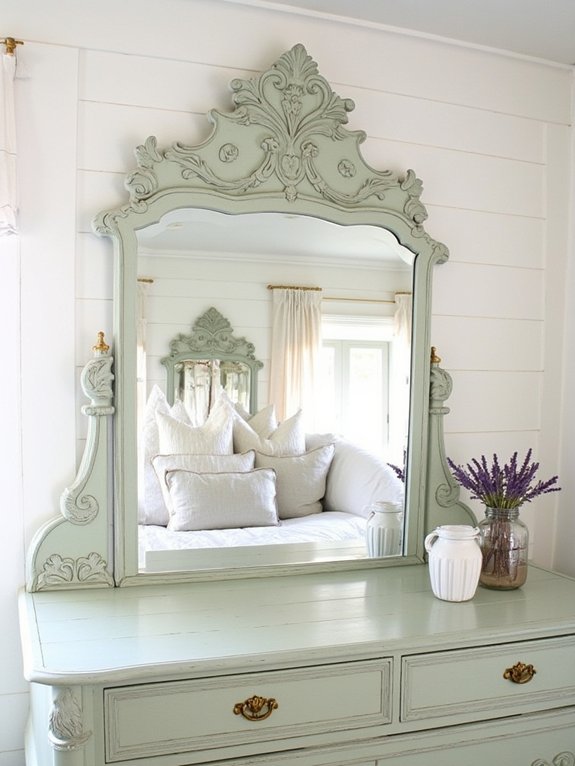 A sage green antique vanity mirror makes a striking centerpiece in any farmhouse-style bedroom. Through careful restoration, a vintage mirror frame can be transformed by sanding, priming, and applying sage chalk paint to achieve an authentically aged appearance.