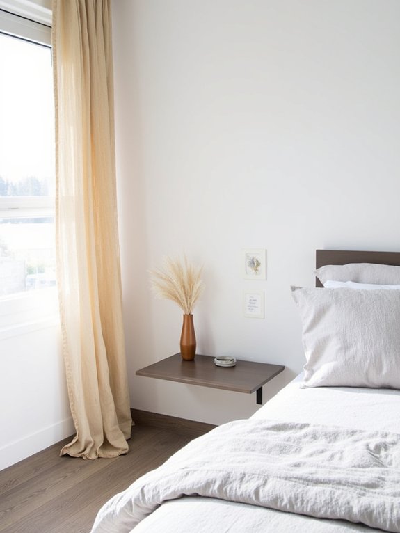 The coffee-colored floating bedside shelf combines form and function in Scandinavian bedroom design. Its minimalist profile and rich warm tone create an elegant storage solution while complementing neutral wall spaces. The floating design maintains clean lines essential to Nordic aesthetics.