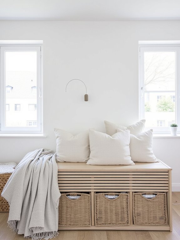 A natural birch storage bench combines functionality with Scandinavian design aesthetics. The light-colored wood creates a bright, airy look while providing hidden storage space beneath its lift-top seat for bedding, clothing, and seasonal items. Positioned at the foot of the bed, it serves as both seating and storage solution.