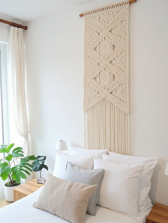 Macrame wall hangings enhance Scandinavian bedroom designs with their handwoven patterns and natural cotton textures. These artisanal pieces create striking focal points while preserving the room’s minimalist character, using geometric shapes and flowing designs that perfectly complement Nordic aesthetics.