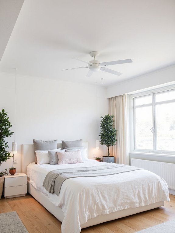 A clean white ceiling fan combines functionality and style in Scandinavian bedroom design. Its minimalist white blades harmonize with neutral decor while providing essential air circulation. The fan’s simple design maintains the room’s serene aesthetic while helping regulate temperature throughout the year.