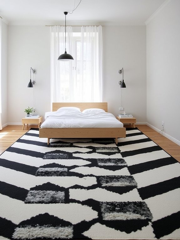 For optimal placement, the rug should extend 24-30 inches beyond the bed’s edges, with its center aligned under the bed’s middle point. In larger rooms, layering multiple geometric rugs adds texture and complexity while preserving the space’s sophisticated simplicity.