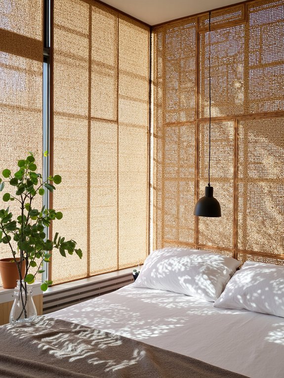 Woven rattan wall panels add organic texture and warmth to Scandinavian bedroom designs while preserving a light, natural aesthetic. These handcrafted panels integrate seamlessly with minimalist décor, creating subtle visual interest through their interwoven patterns and dimensional qualities.