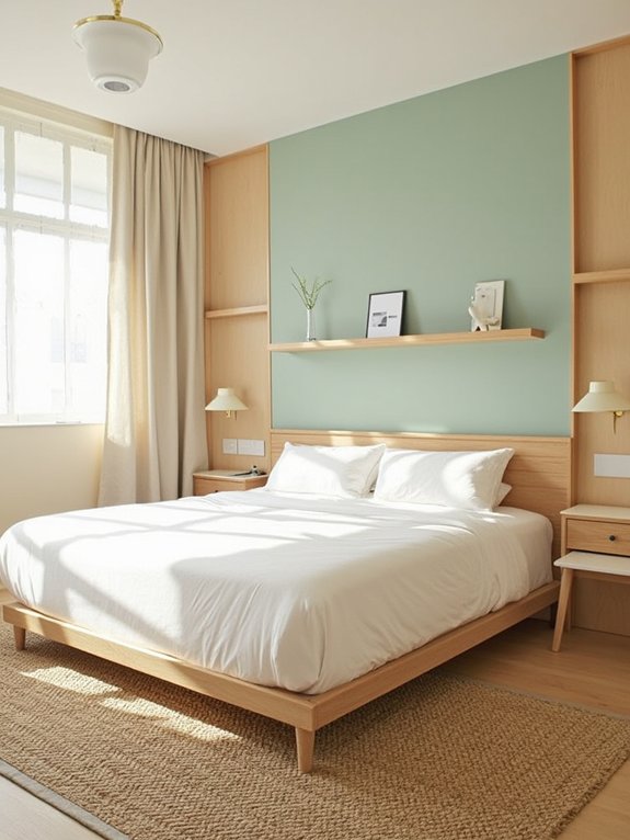 A sage green accent wall brings natural serenity to bedroom spaces while adhering to Scandinavian design principles. When paired with neutral furnishings and organic textures, this soft, earthy tone creates a sophisticated focal point that enhances the room’s overall aesthetic without compromising its minimalist appeal.