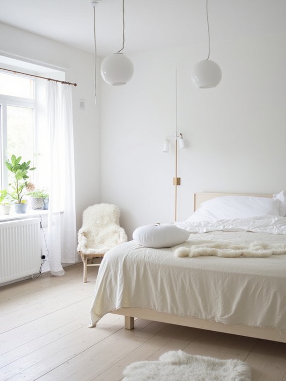 The optimal installation includes adjustable height settings of 18-36 inches from the ceiling, with fixtures positioned 24-30 inches above bedside tables. Matte white finishes maintain authentic Scandinavian style, while dimmer controls allow for versatile lighting adjustment throughout the day.